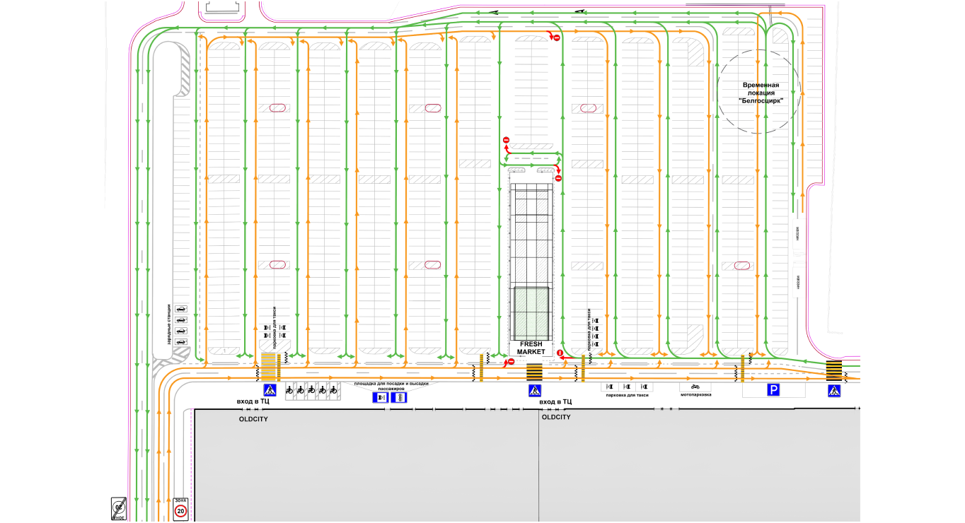 В связи с расширением площадки для проведения специализированных, сезонных, сельскохозяйственных ярмарок на внутренней парковке торгового центра OldCity, были внесены изменения в организацию дорожного движения для безопасности пешеходов и автомобилей.